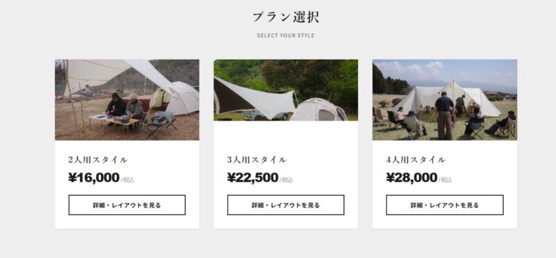気になるお値段ですが、2人用スタイルで16,000円〜という設定にしました。 正直、これだけのギアを揃えて設営まで付いてこの価格は、自分でも「やりすぎた」と思ってます。
